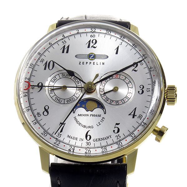 大西洋横断の定期旅客便として作られた「LZ129」は、航空機史上初めての船内にピアノを置き空中コンサートを開くなど、贅を尽くした最高のサービスを提供する飛行船として知られていました。ヒンデンブルク ムーンフェイズは、日・曜日表示に加え、月の満ち欠けを表示するムーンフェイズ、1年間を52周とした週表示ポインターを搭載。意匠を凝らしたデザインと個性あふれる機能性に富んだ、「LZ129」ならではの贅沢な逸品です。プレゼントやギフトにもおすすめ。